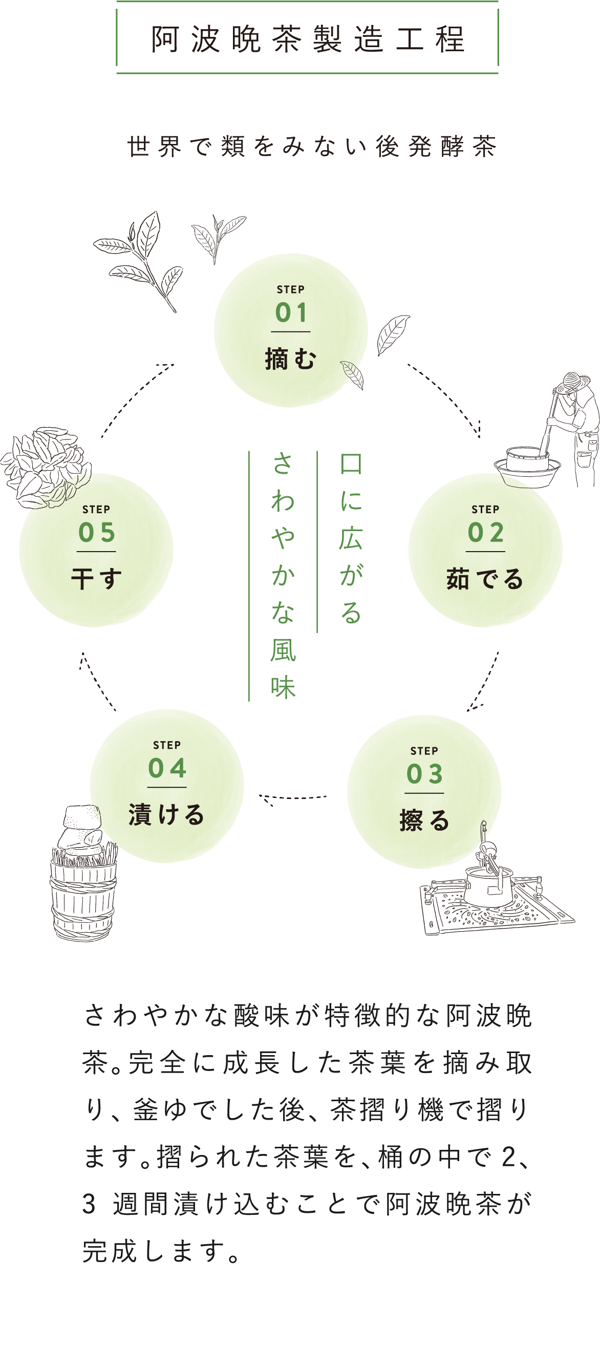 摘んだ茶葉をすぐに加熱し酸化を止め、揉捻などの加工工程を経た後で、微生物によって発酵させて作るお茶です。その中でも、世界で数えるほどしか類似例を見ない、乳酸菌を使った独自の発酵製法である阿波晩茶。徳島県上勝町の家々で古くから作られ、飲まれつづけられてきました。口に広がるさわやかな風味が特徴です。