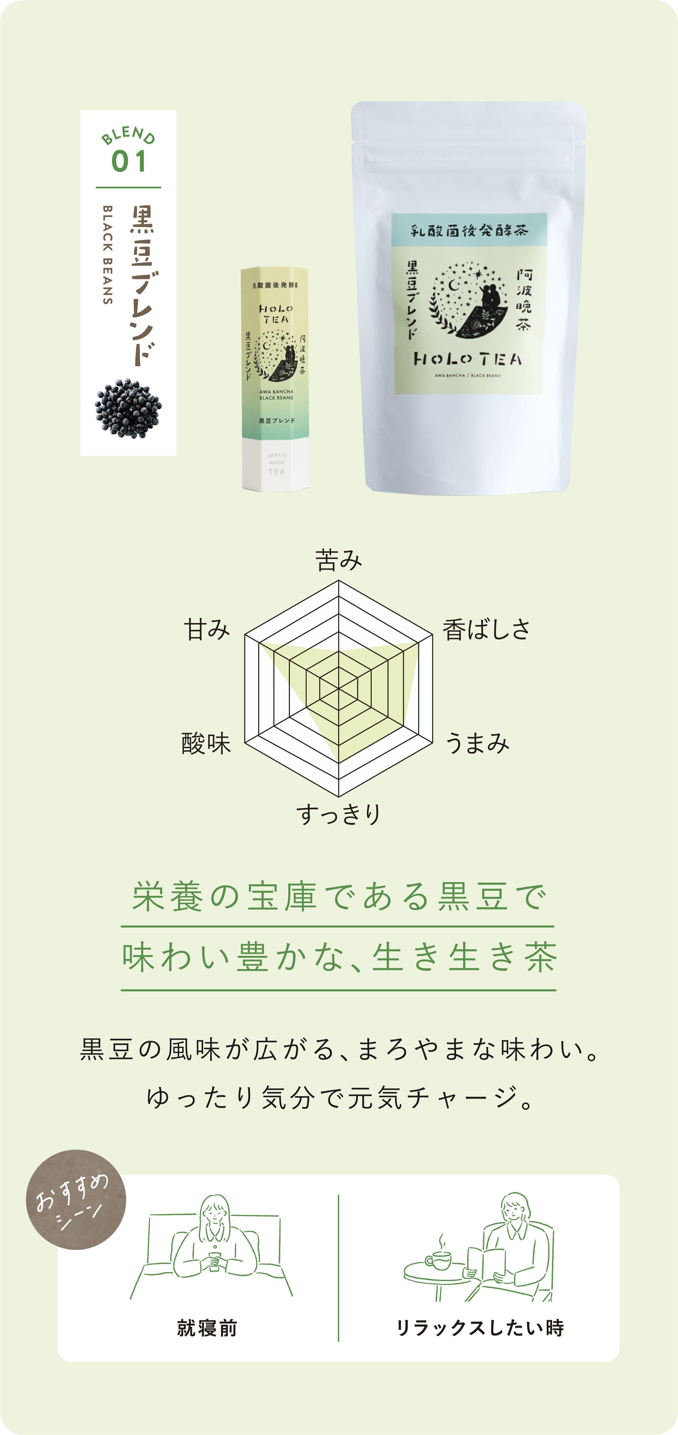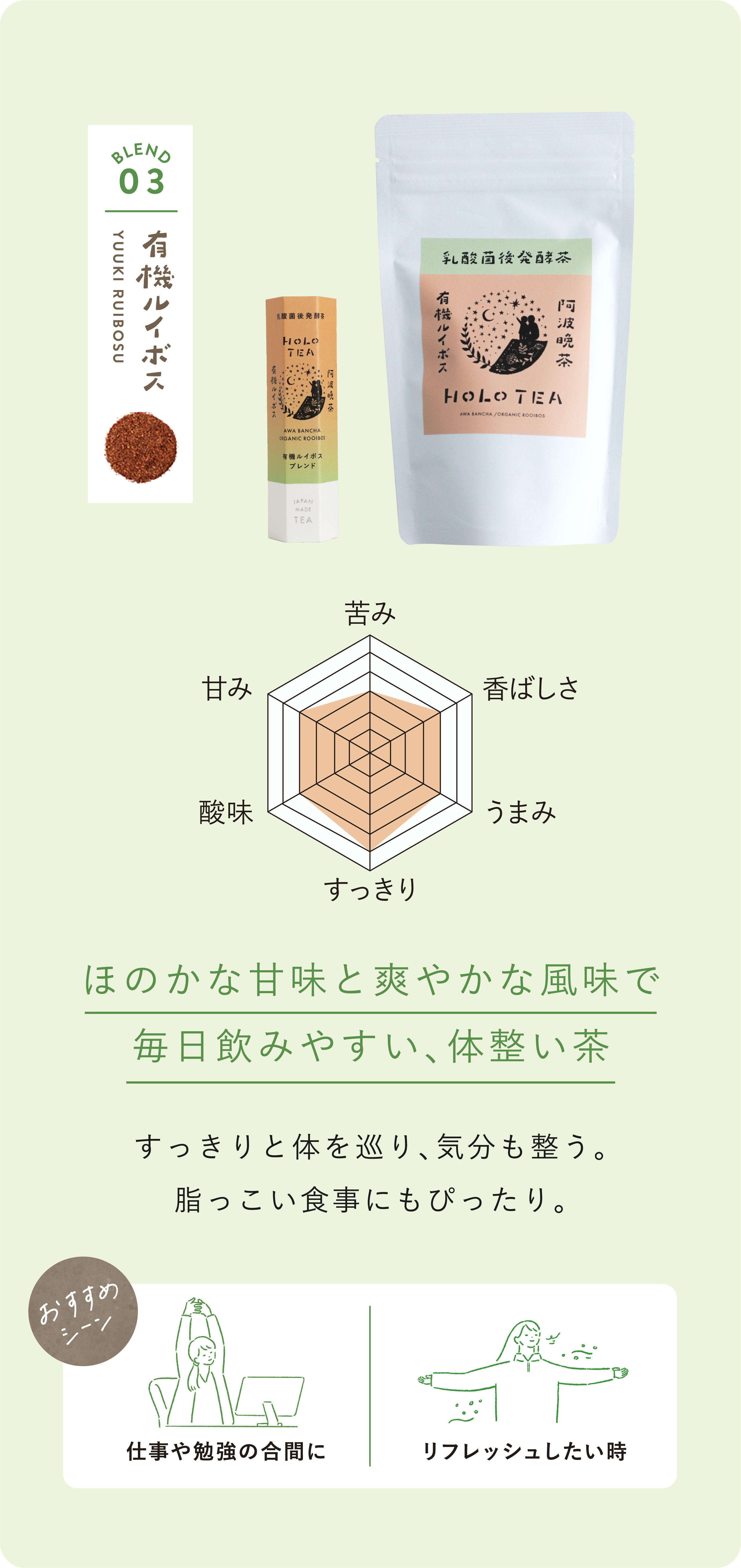 皮膚科に毎月通っていて、HOLOのクリームに出会い、調子が良いのでお茶も試してみました。「阿波晩茶」はテレビで特集されているのを一度見たことがありました。ほんのりとした酸味があり、かゆみがあるときに飲むと静まるように思います。